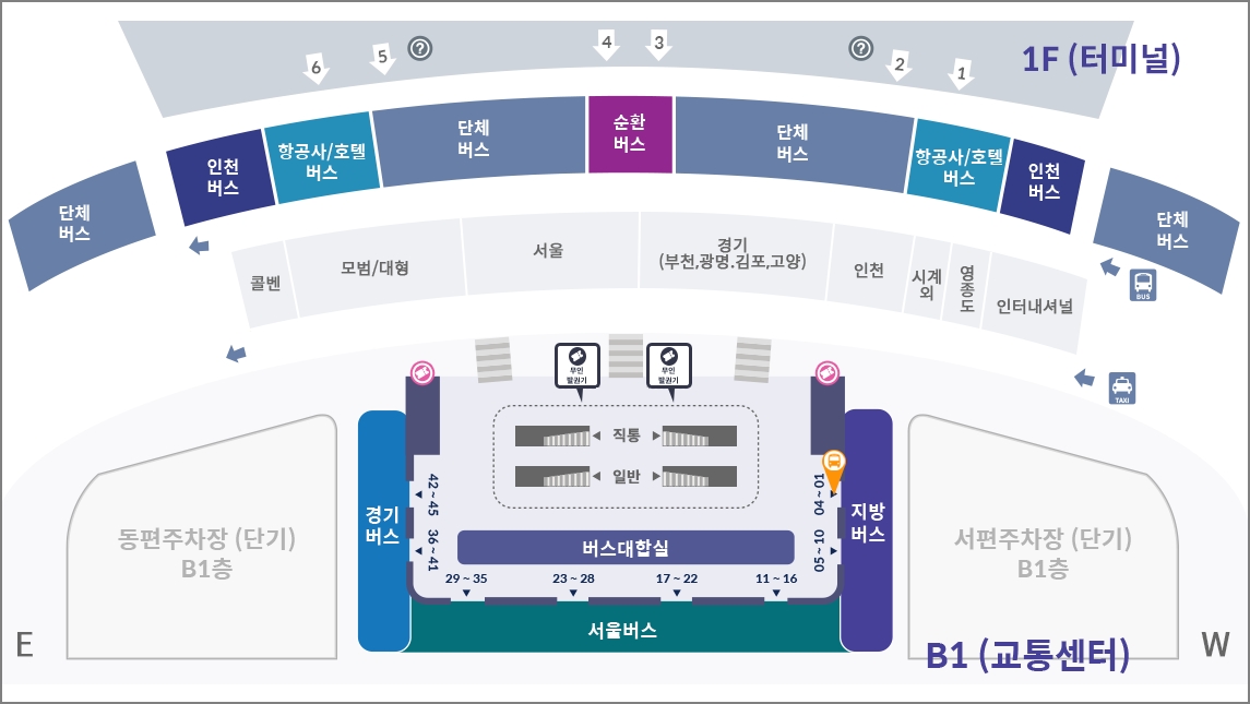 인천공항에서 노포동 부산터미널 방면으로 운행하는 버스 탑승을 원하시는 경우 아시아나 항공 및 제주항공 등이 취항하는 제1 터미널의 경우 1 층 11번 승차장을 이용하시면 되며, KLM네덜란드항공, 가루다인도네시아, 대한항공, 델타항공, 샤먼항공, 에어 프랑스, 중화항공, 진에어 등이 취항하는 제2 터미널의 경우에는 교통센터 지하 1층 4번 승차장을 이용하시면 됩니다.