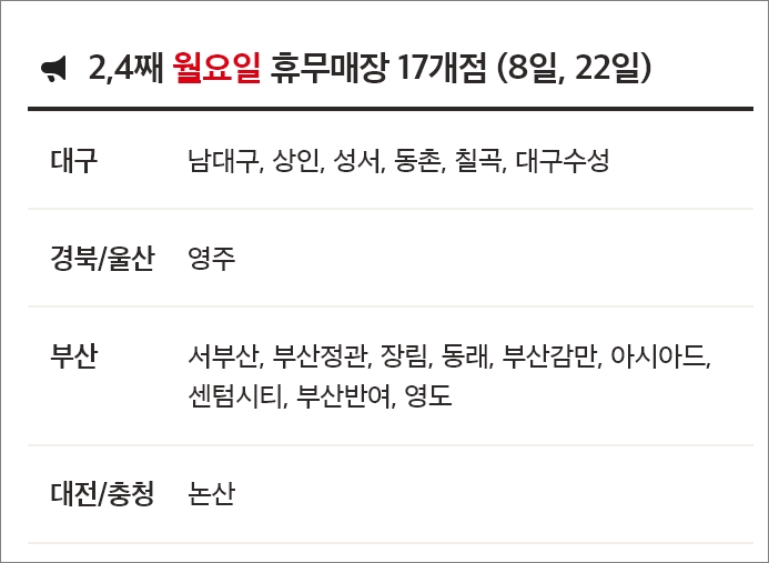 2025년 12월 2주 및 4주 월요일인 8일과 22일에는 대구지역과 부산지역 위주로 17개 지점이 휴무를 진행합니다.