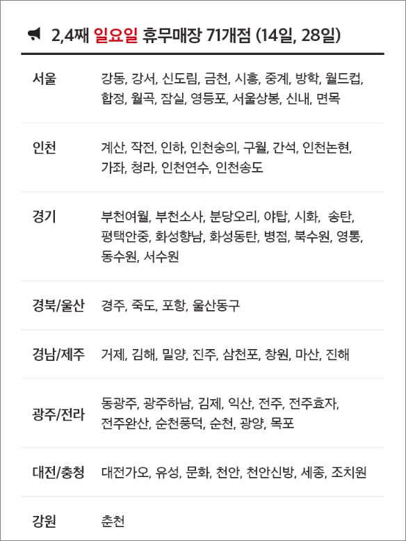 12월 2주 및 4주 일요일인 14일과 28일에 휴무가 예정되어 있는 매장은 71개점이니 참고하시면 좋을 듯합니다.